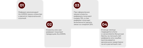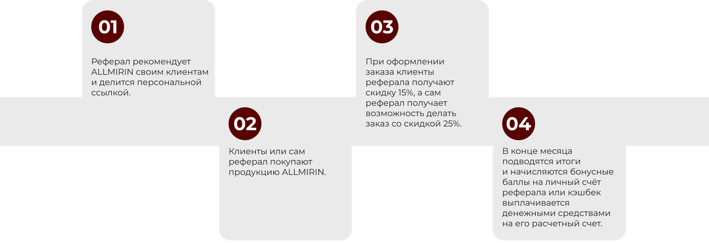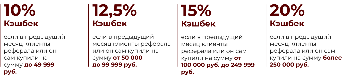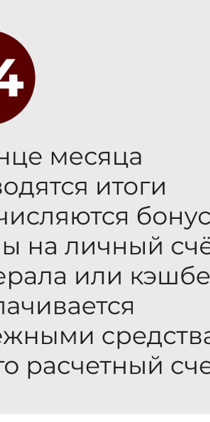 По итогам месяца в зависимости от объёма продаж, кэшбек начисляется бонусными баллами на внутренний счёт реферала до 5 числа следующего месяца.