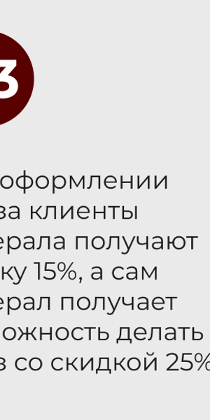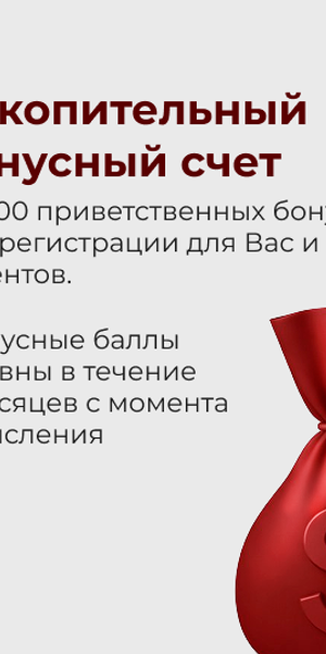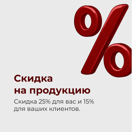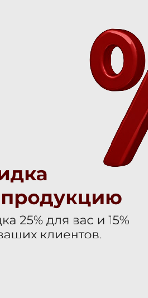 Скидка 25% для Вас (15% для ваших клиентов) применяется с помощью списания баллов с бонусного счёта. Заказ учитывается в объем продаж реферала.